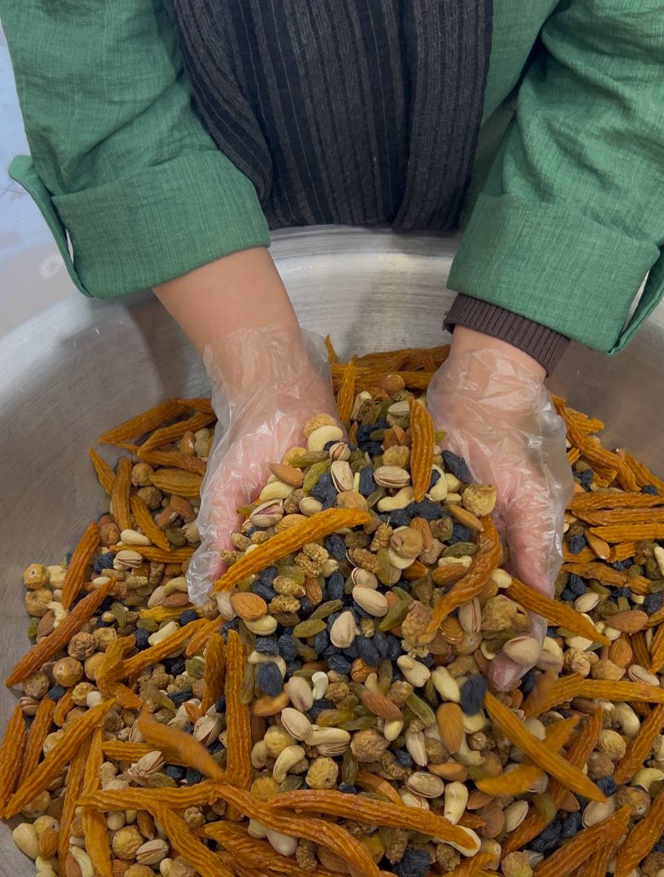 پسته درشت. بادام درختی درشت. بادام هندی اعلا. مویز بدون هسته. کشمش سبز. بامیه زردآلو. انجیر استهبان. توت پاستیلی مشهد